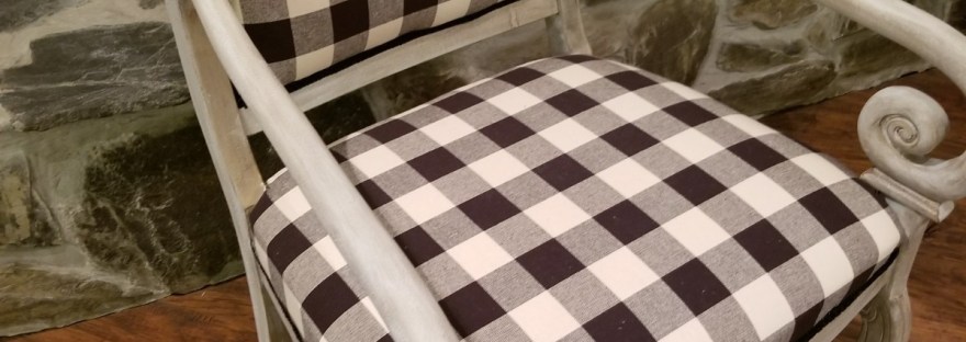 Last, I added some new fabric in a beautiful buffalo check that I purchased at Hobby Lobby.  This was my first upholstered piece that I had tackled, and it was harder than I expected it to be.  I just pulled it as taut and smooth as I could get it and stapled it in place.  I then used super adhesive fabric glue to attach a black rope trim around the edges to hide the staples.